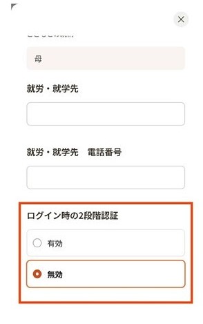 「利用者(保護者)情報の登録・変更」 利用者(保護者)情報の登録・変更の際に画像のように「ログイン時の2段階認証」を「無効」に変更することで次回のログイン時からワンタイムパスワードを省略できます。