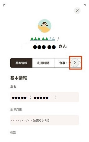 画像のようにお子さま情報の登録・変更ができます。 登録・変更できる項目は以下のとおりです。 ※画像赤枠の矢印をタップすると病気・予防接種の情報などが表示されます。食事・アレルギー情報や病気・予防接種の情報等は初回面談日までにご入力ください。 |