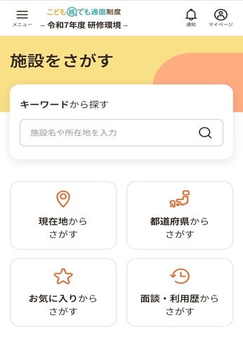 「施設をさがす」では全国のこども誰でも通園制度の実施事業所を検索することができます。 施設をさがす画面への入り方は2種類あります。 【施設をさがす画面への入り方1】