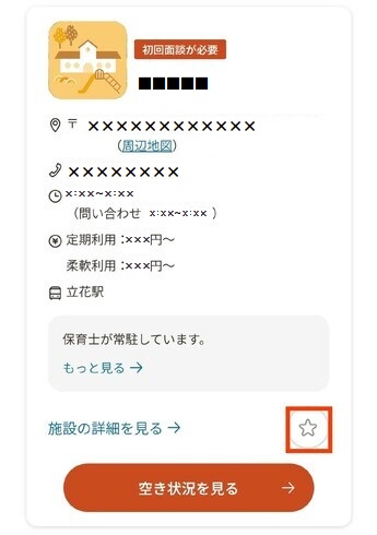 「1 施設をさがすへの入り方を参照」 利用希望施設を選択すると左画像の画面が表示されます。「空き状況を見る」を選択してください。 画像の赤枠にある星印をタップすることでお気に入りに登録できます。
