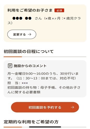 初回面談希望のお子さまを選択」 初回面談を希望するお子さまを選択後、初回面談の日程についての事業所からのコメントを確認してください。初回面談の可能日や当日の持ち物などの説明が記載されています。確認後、「初回面談を予約する」を選択してください。 ※ 画像にある施設からのコメントはサンプルです。事業所ごとに内容が異なりますので必ずご確認ください。 |