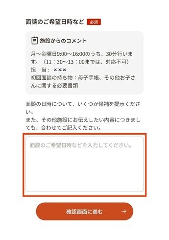 「初回面談を予約する」を選択すると面談希望日時の入力画面になります。画像赤枠内に「施設からのコメント」を基に希望する面談日時を入力し、「確認画面に進む」を選択してください。 |