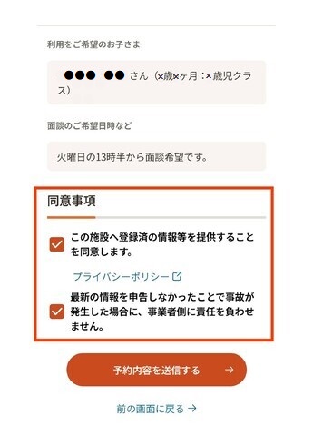 「確認画面に進む」を選択すると画像赤枠のように同意事項が表示されます。同意事項にチェックの上、「予約内容を送信する」を選択してください。 |