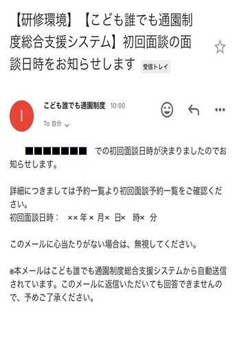 「予約内容を送信する」を選択し、施設から初回面談の予約が承認されると画像のようなメールが届きます。初回面談日時の確定となりますので、予約された日時で初回面談を行ってください。 |