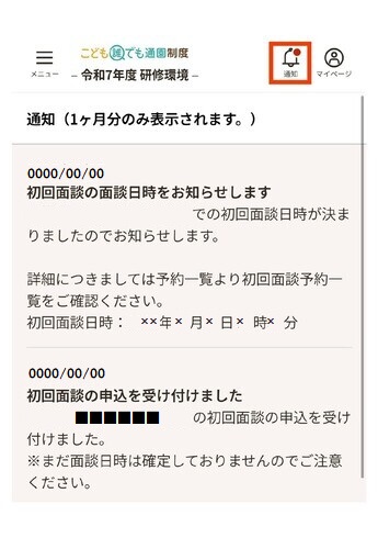 マイページの画像赤枠にある通知をタップすることで初回面談日時を確認することもできます。 初回面談日までに、お子さんのアレルギーや予防接種歴、健診での指摘等についてご入力ください。 ※ 初回面談については利用者からの総合支援システム操作で予約の変更やキャンセルができません。変更やキャンセルの事由が生じた場合は、できる限り速やかに事業所へご連絡ください。 |