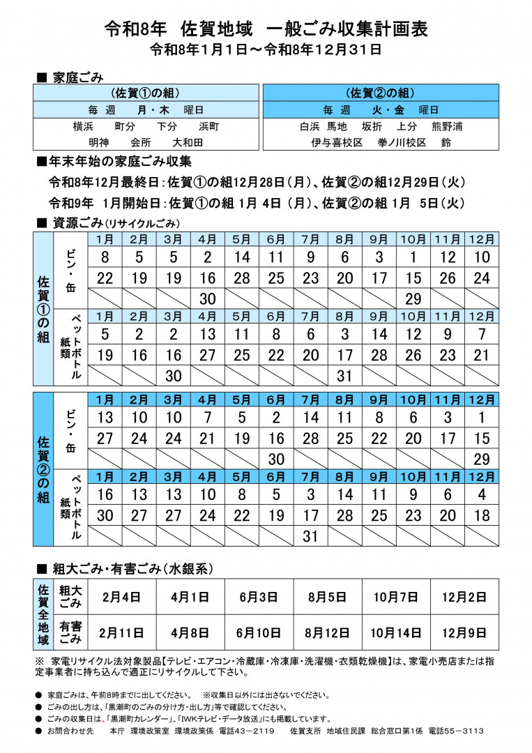 家庭ごみ・資源ごみ・粗大ごみの収集計画表です。