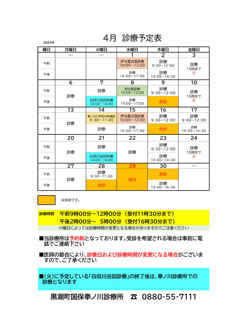 拳ノ川診療所 診療予定