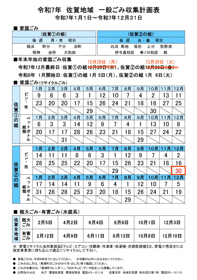 正: | 【大方地域】月・木曜日の組 12月29日(月)、火・金曜日の組12月30日(火) 【佐賀地域】佐賀①の組 12月29日(月)、 佐賀②の組 12月30日(火) |