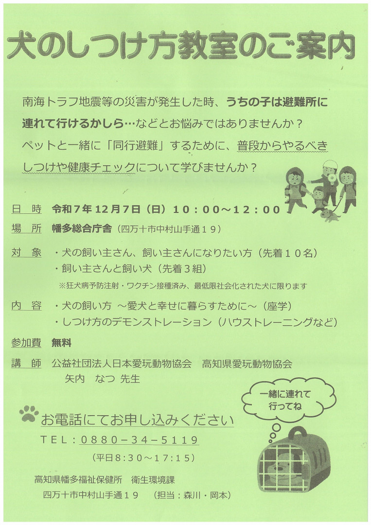 このたび、幡多福祉保健所より、「犬のしつけ方教室」の開催案内 ... 続きを読む