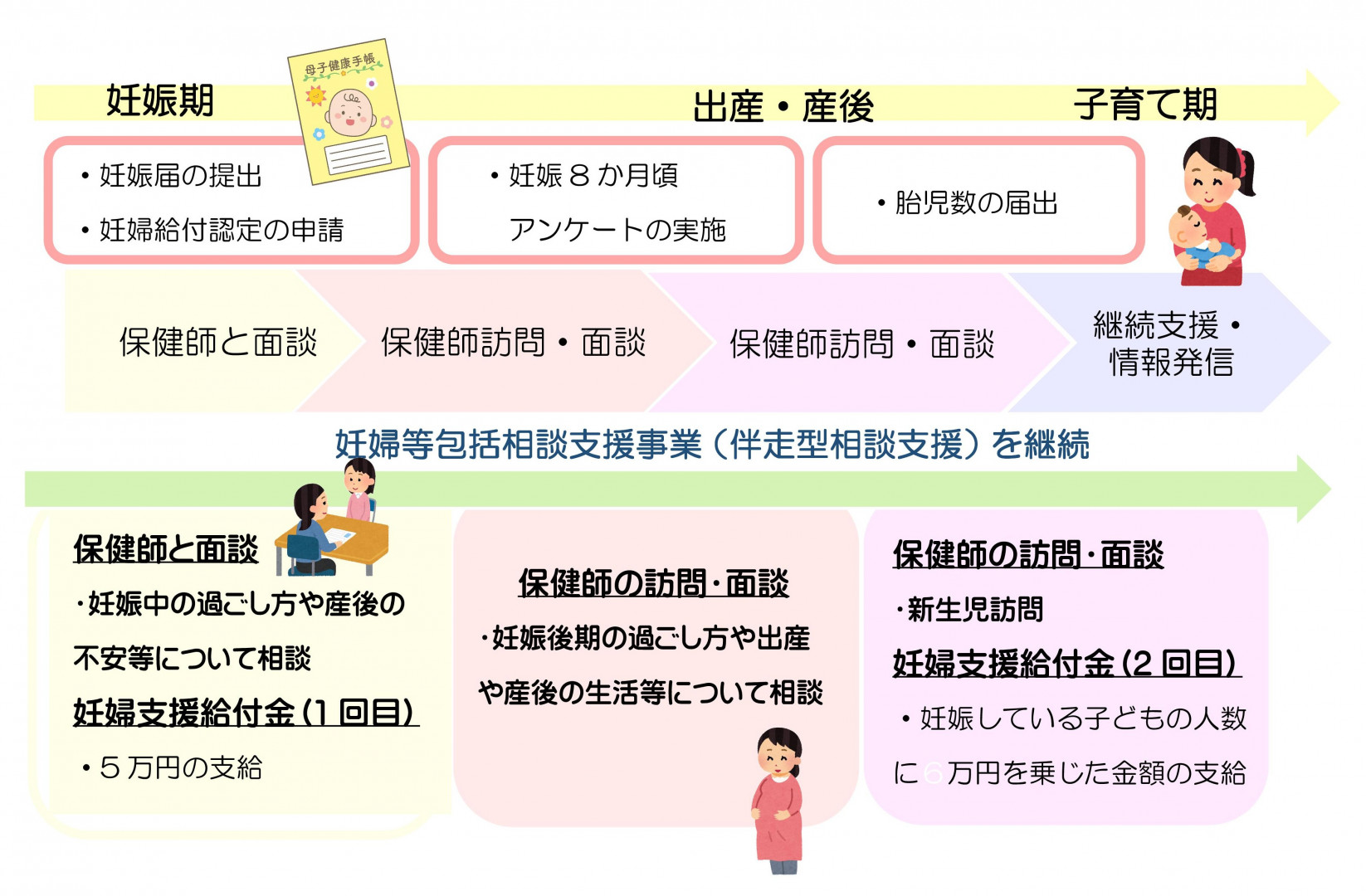 令和7年4月より、妊娠期からの切れ目ない支援を行う観点から、子ども・子育て支援法に「妊婦のための支援給付」が創設され、認定を受けた方には「妊婦支援給付金」が支給されます。