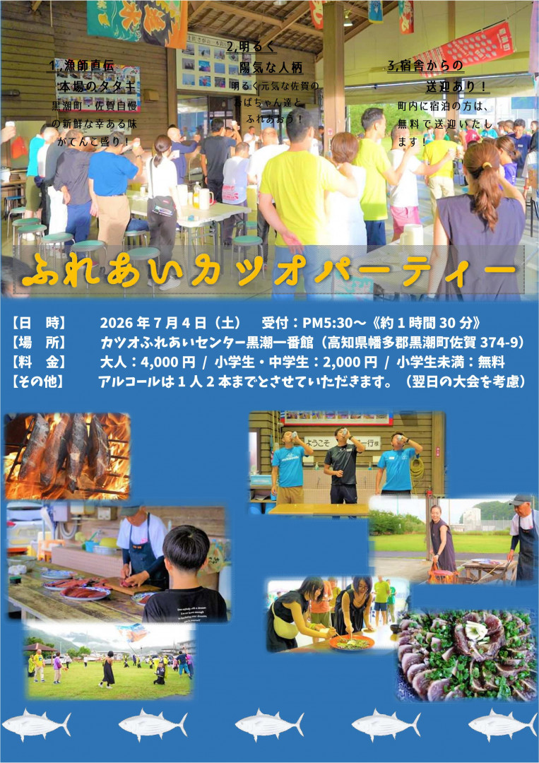今回で第33回をむかえます。また、大会前日には「ふれあいカツオパーティー」を開催します。カツオ一本釣り漁師町・黒潮町佐賀のタタキはその日に釣れたとびきり新鮮なカツオを使っているので、他のタタキとはひと味違います。アクアスロンと一緒に、日本一のカツオも味わってください。