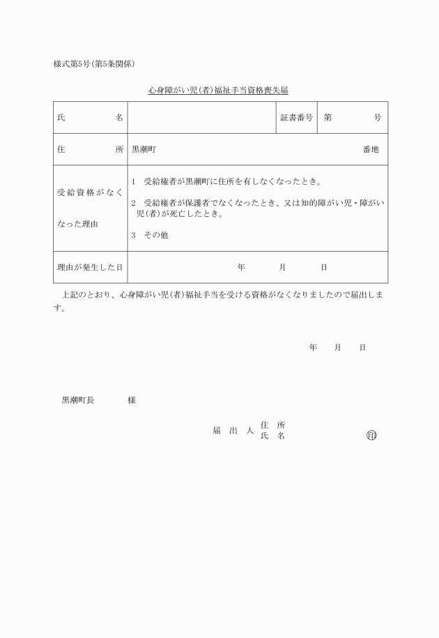 第4条 受給権者が住所を変更したときは、心身障がい児(者)福祉手当受給権者住所変更届(様式第4号)を速やかに町長に提出しなければならない。