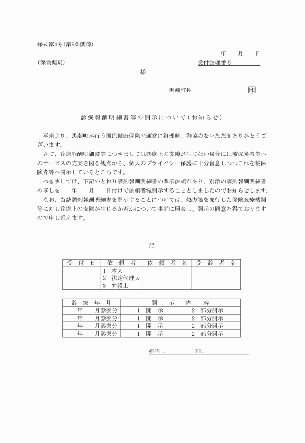 開示又は部分開示の決定を行ったときは、診療報酬明細書等の開示についてのお知らせ(様式第6号)に「黒潮町」及び「開示日」を押印した交付用コピーレセプト(1部に限る。)を添付の上、速やかに依頼者に交付する。なお、この場合、開示依頼書の依頼者欄の「住所」欄に記載された住所宛に「親展」扱いで送付する。