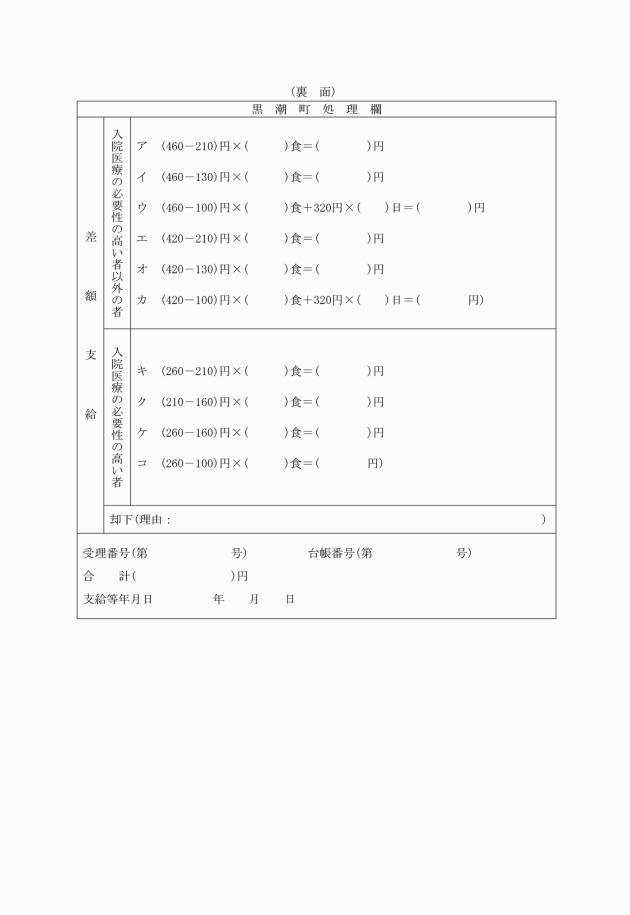 ウ 食事療養標準負担額差額支給申請書の町処理欄に却下年月日等所要事項を記入すること。