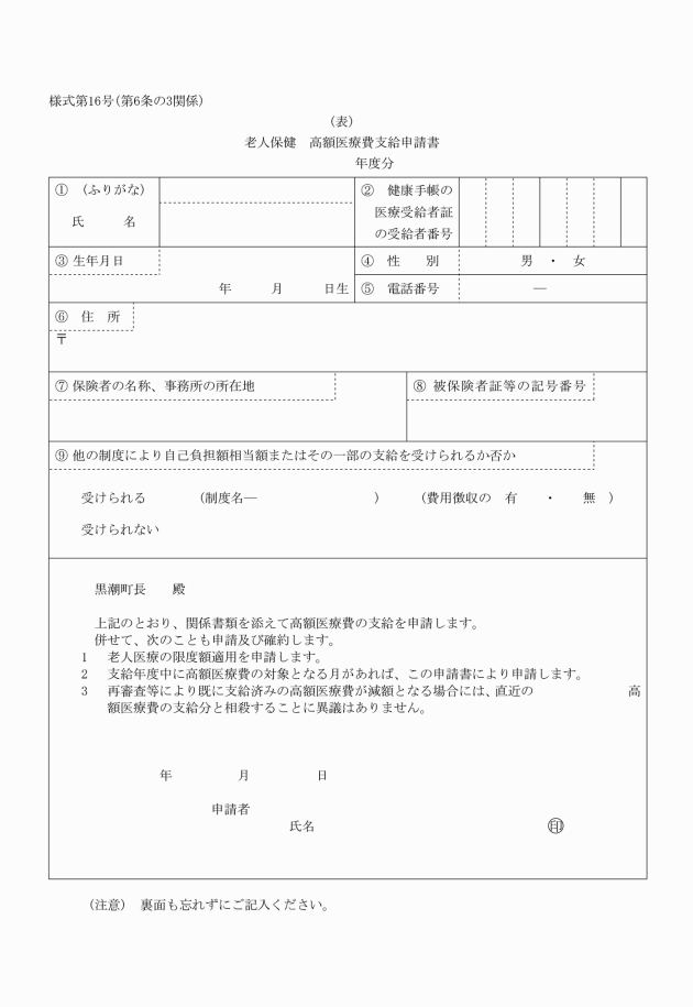 第6条の3 高額医療費支給台帳は、施行規則第52条の規定により老人保健高額医療費支給申請書(様式第16号。以下「高額医療費支給申請書」という。)に基づき高額医療費を支給するときに整理するものとする。
