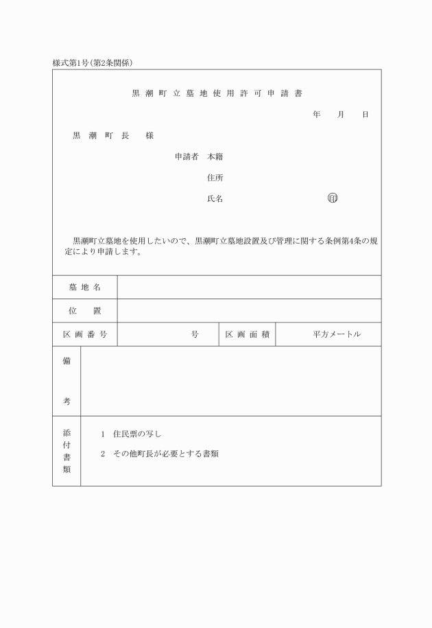 第10条 使用者が、墓地に遺骨の埋蔵又は改葬をしようとするときは、黒潮町立墓地埋蔵(埋葬)・改葬届(様式第11号)に墓地、埋葬等に関する法律(昭和23年法律第48号)第8条の規定により交付された火葬許可証又は改葬許可証を添えて、町長に提出しなければならない。