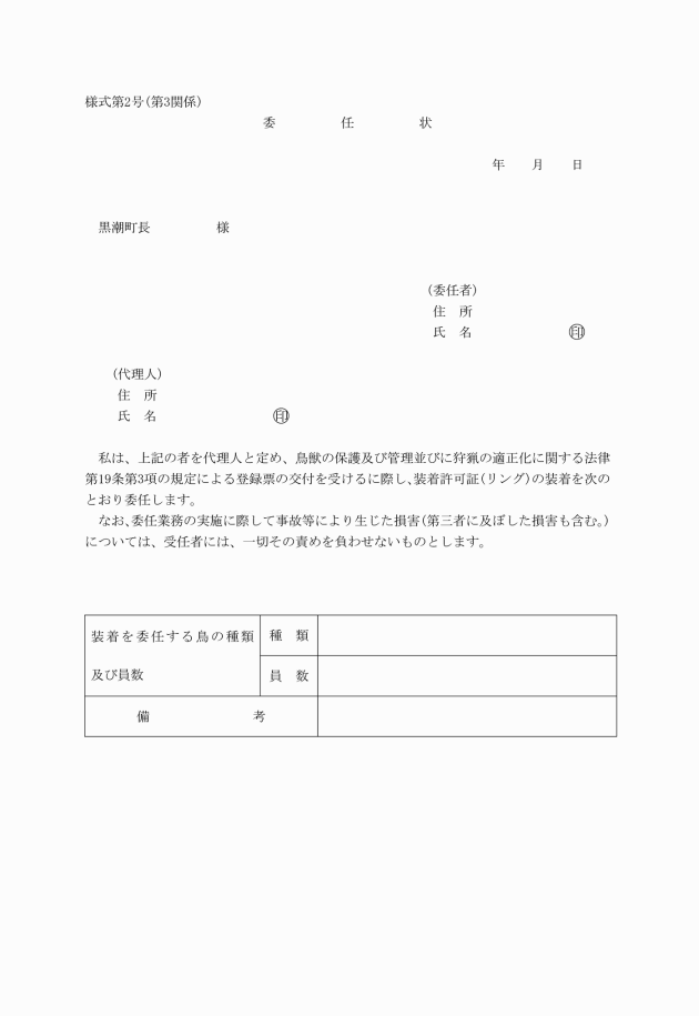 鳥獣の保護及び管理並びに狩猟の適正化に関する法律(平成14年法律第88号。以下「法」という。)第19条の規定に基づく登録票の発行事務の取扱いについては、法、鳥獣の保護及び管理並びに狩猟の適正化に関する法律施行規則(平成14年環境省令第28号)、高知県の事務処理の特例に関する条例(平成12年高知県条例第7号)及び黒潮町鳥獣の保護及び管理並びに狩猟の適正化に関する法律施行規則(平成18年黒潮町規則第99号。以下「施行規則」という。)に定めるもののほか、この訓令によるものとする。
