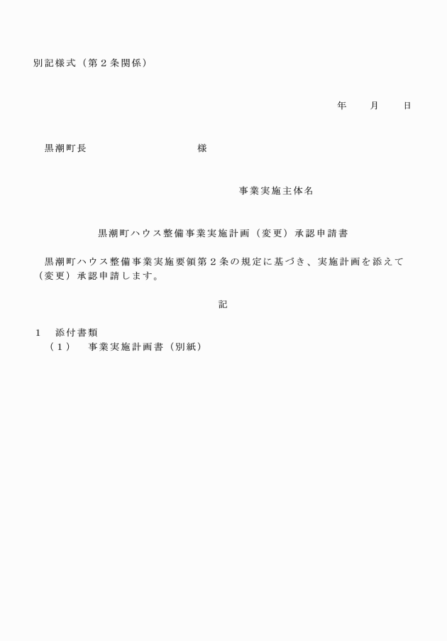 第2条 ハウス経営事業者(以下「事業実施主体」という。)は、黒潮町ハウス整備事業実施計画(変更)承認申請書(別記様式)を、町長に提出するものとする。