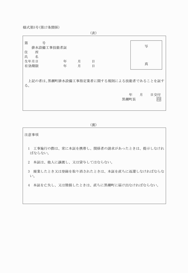 第6条 町長は、指定業者を指定したときは、排水設備工事指定業者証(様式第2号)を交付するものとする。
