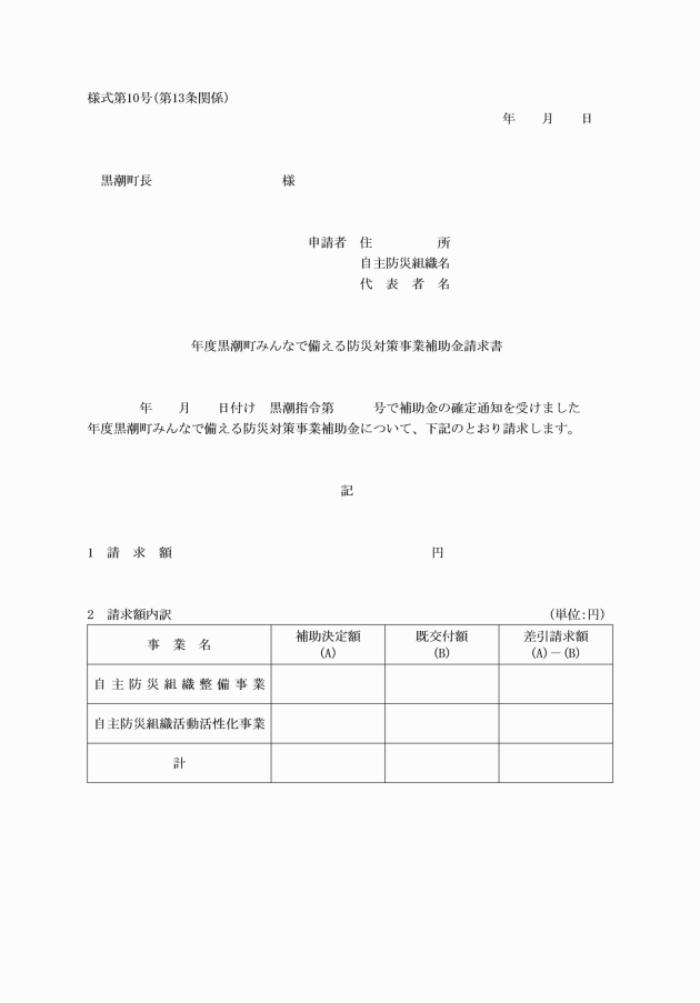 第10条 補助対象団体は、補助金交付決定額の5分の4に相当する額を限度として、黒潮町みんなで備える防災対策事業補助金概算請求書(様式第7号)により補助金の概算払を請求することができる。