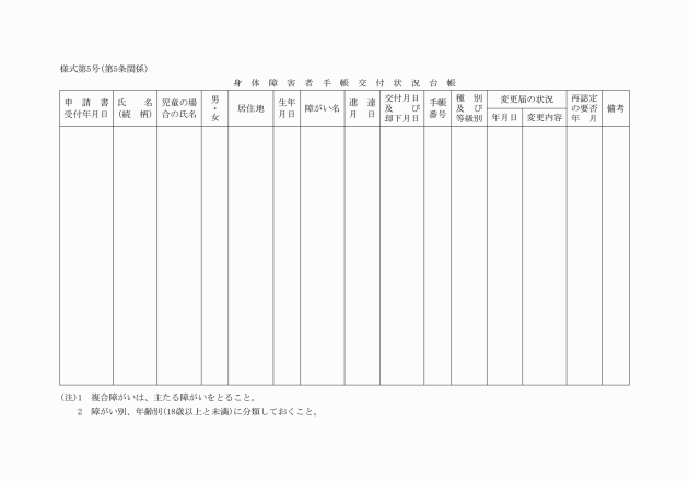 第5条 町長は、身体障害者手帳交付状況台帳(様式第5号)を備え、身体障害者手帳の交付状況その他必要な事項を記載しておかなければならない。