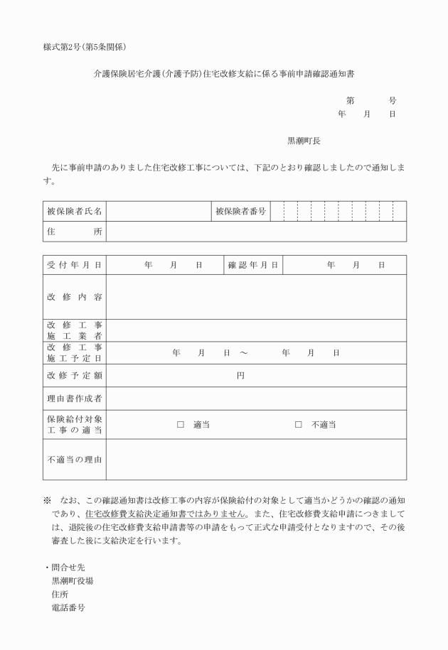 第5条 受領委任により住宅改修をしようとする居宅要介護等被保険者は、住宅改修着工前に次の各号に掲げる書類を町長に提出しなければならない。