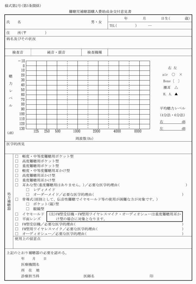 第2条 難聴児補聴器購入費助成金(以下「助成金」という。)の交付を受けることができる者(以下「交付対象児(者)」という。)は、町内に住所を有する者で、両耳の聴力レベルが30デシベル以上であり、身体障害者手帳の交付の対象とならない次のいずれかのものとする。ただし、医師が装用の必要を認めた場合は、30デシベル未満も対象とする。