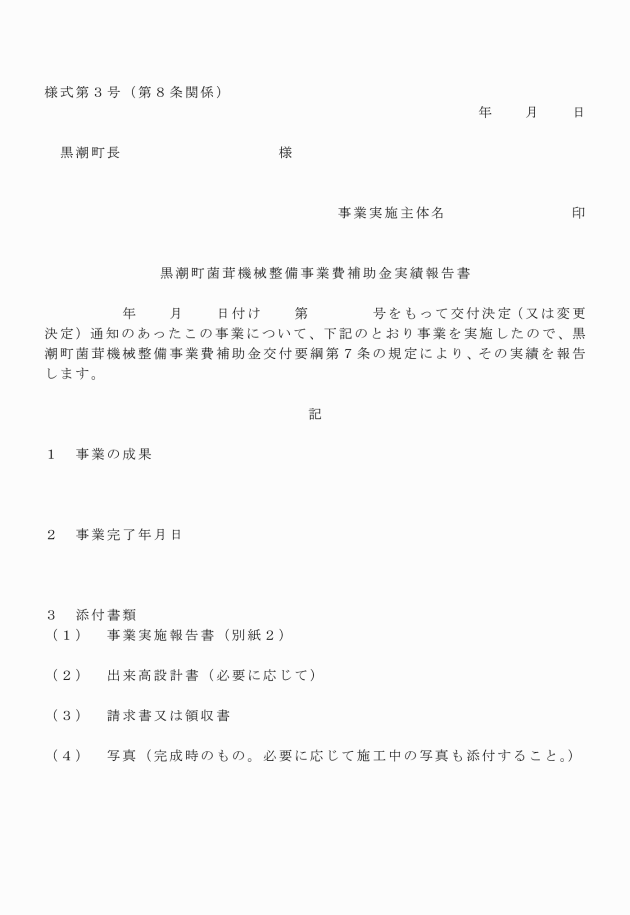 第4条 事業実施主体は、補助金の交付を受けようとするときは、黒潮町菌茸機械整備事業費補助金交付申請書(様式第1号)を町長に提出するものとする。