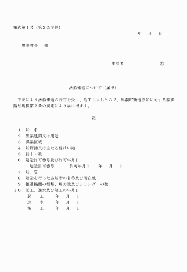 第1条 町は、漁業振興のため予算の範囲内で次に該当する新造漁船に対し、船旗一流を贈与する。
