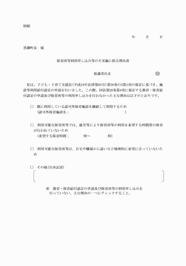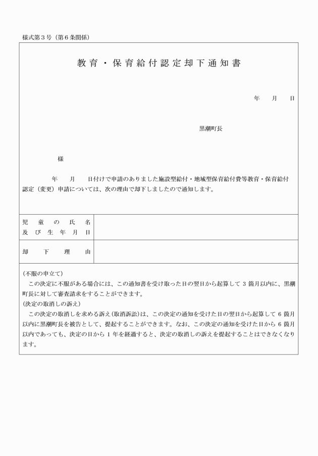 4 町長は、選考の結果、教育・保育給付認定子どもの入所を承諾することができないときは、利用不承諾通知書(様式第9号)により教育・保育給付認定保護者に通知しなければならない。