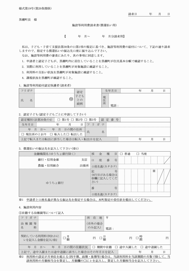 第20条 府令第28条の19に規定する請求書は、施設等利用費請求書(償還払い用)(様式第19号)によるものとする。