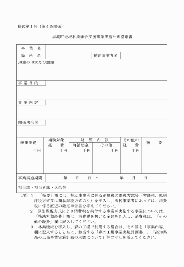 第4条 補助事業者が補助事業を実施しようとするときは、黒潮町地域林業総合支援事業実施計画協議書(様式第1号。以下「実施計画協議書」という。)を町長に提出しなければならない。