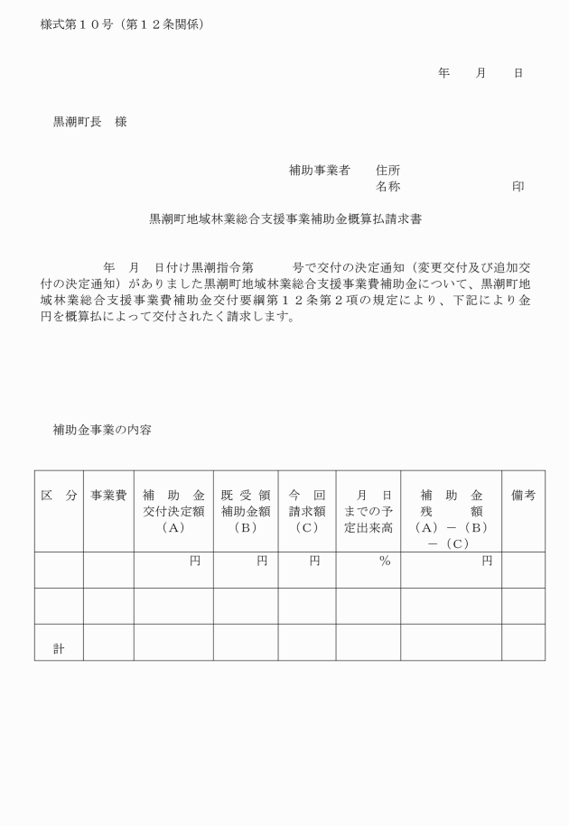 2 補助金交付の決定通知を受けた補助事業者が補助金の概算払の請求をしようとするときは、黒潮町地域林業総合支援事業補助金概算払請求書(様式第10号)を町長に提出するものとする。