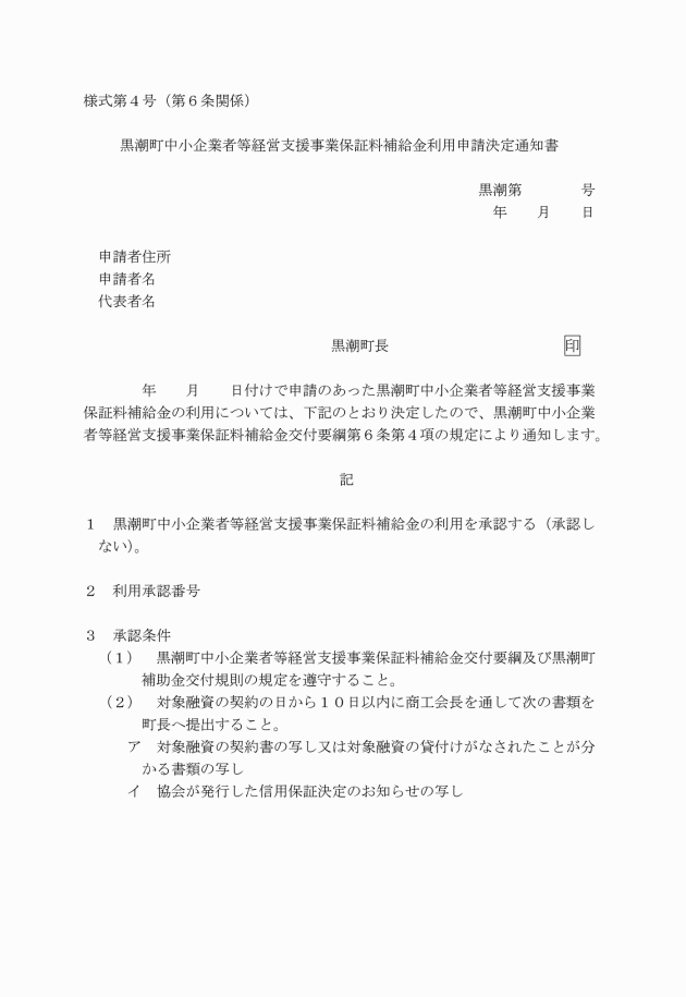 4 町長は、利用申請書を受理したときは速やかに審査を行い、補給金の利用の承認の可否について決定し、黒潮町中小企業者等経営支援事業保証料補給金利用申請決定通知書(様式第4号)により商工会長を通して申請者に通知するものとする。