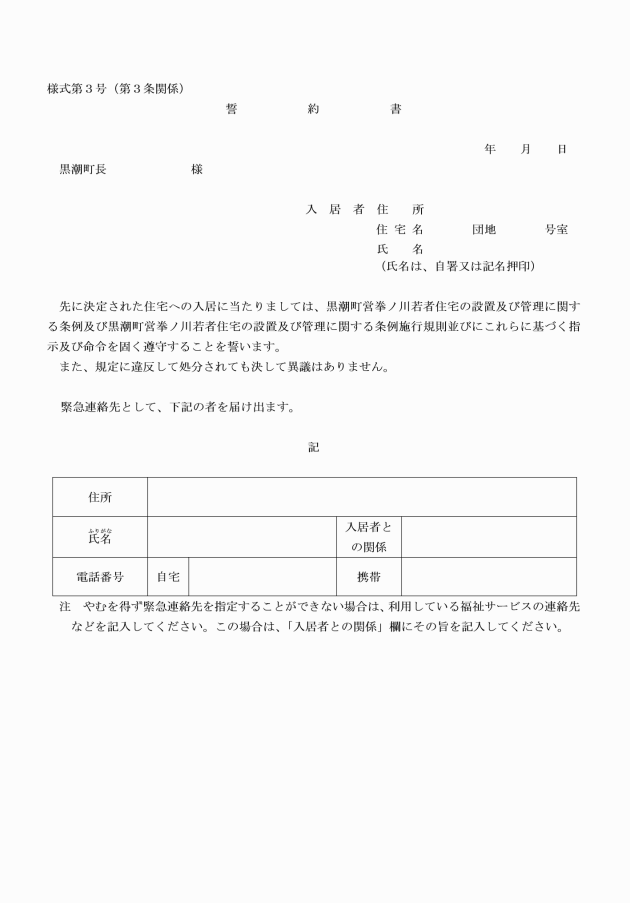 第3条 条例第6条第2項の規定により入居を許可された者(以下「入居者」という。)は、条例第9条第1項第1号の規定により、誓約書(様式第3号)を町長に提出しなければならない。