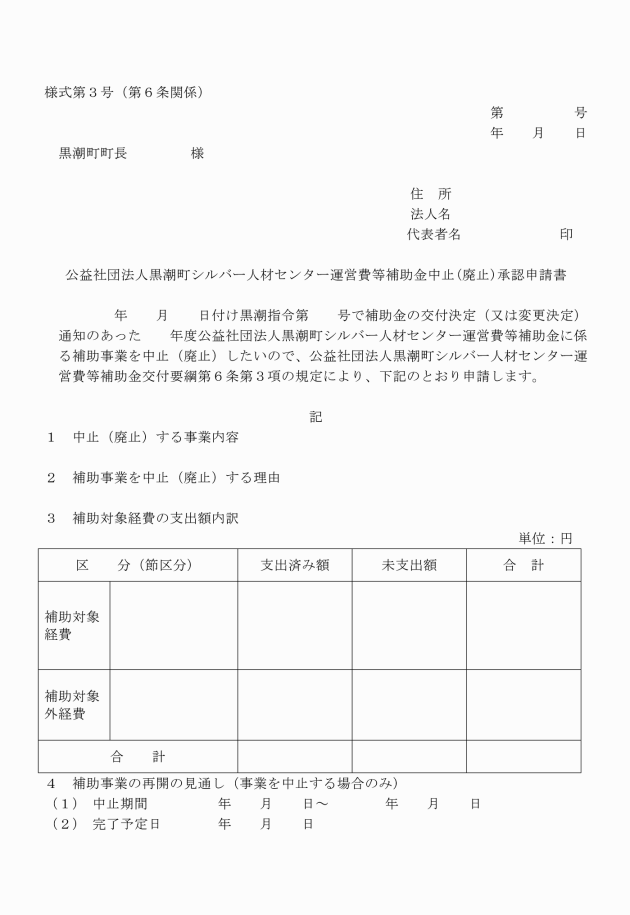 3 センターは、事業を中止又は廃止しようとするときは、公益社団法人黒潮町シルバー人材センター運営費等補助金中止(廃止)承認申請書(様式第3号。以下「中止(廃止)承認申請書」という。)を町長に提出し、その承認を受けなければならない。