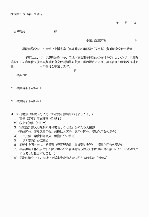 第5条 事業実施主体は、補助金の交付を受けようとするときは、黒潮町施設レモン産地化支援事業(実施計画の承認及び同事業)費補助金交付申請書(様式第1号。以下「承認及び交付申請書」という。)を町長に提出しなければならない。