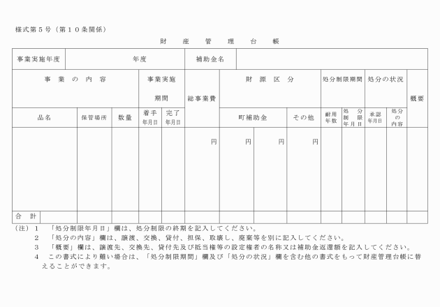 (5) 取得財産については、処分制限期間内において、補助金の交付の目的に反して使用し、譲渡し、交換し、廃棄し、貸し付け、又は担保に供する場合は、事前に町長の承認を受けなければならないこと。