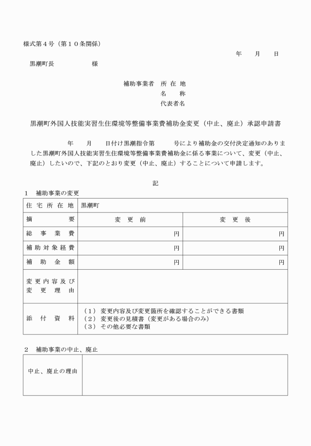 第8条 補助金の交付を受けようとする補助対象者(以下「申請者」という。)は、黒潮町外国人技能実習生住環境等整備事業費補助金交付申請書(様式第1号)に次に掲げる関係書類を添えて、町長に提出しなければならない。