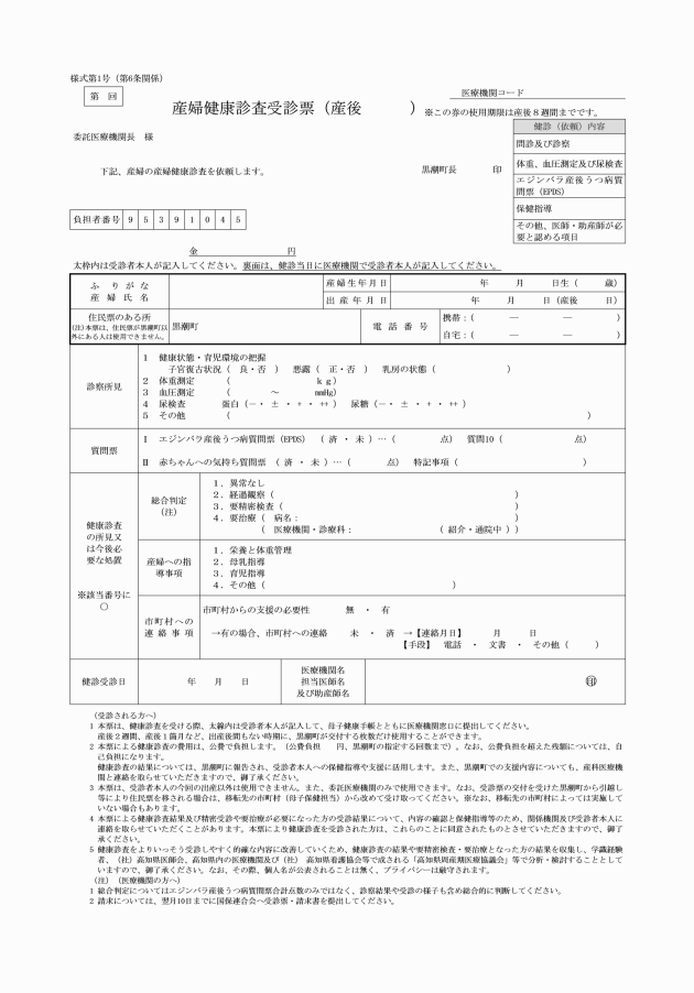 第9条 委託医療機関は、健康診査を行ったときには、町が負担する金額を委託医療機関の請求書に産婦健康診査受診票を添付して町長に請求するものとする。