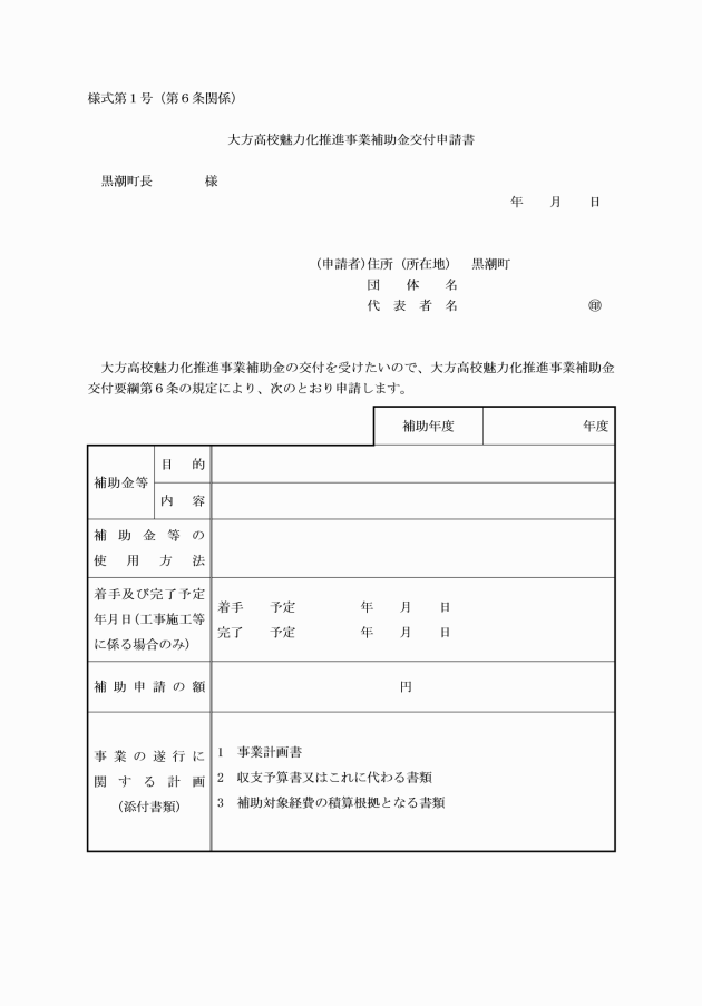 第6条 補助事業者は、補助金の交付を受けようとするときは、大方高校魅力化推進事業補助金交付申請書(様式第1号。以下「申請書」という。)に関係書類を添えて、町長に申請しなければならない。