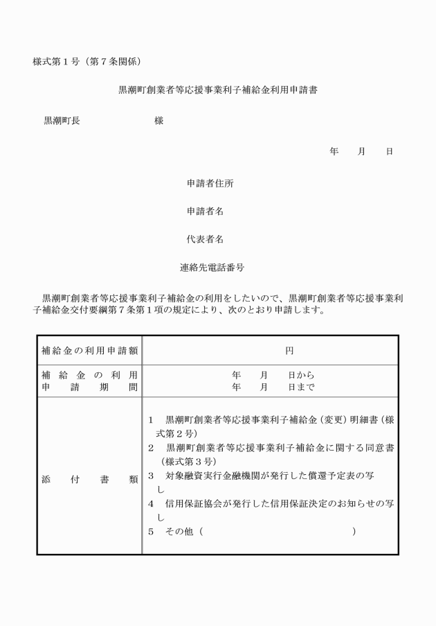 第7条 補給金の利用をしようとする中小企業者等(以下「利用申請者」という。)は、黒潮町創業者等応援事業利子補給金利用申請書(様式第1号。以下「利用申請書」という。)に次の書類を添え、商工会長に提出するものとする。