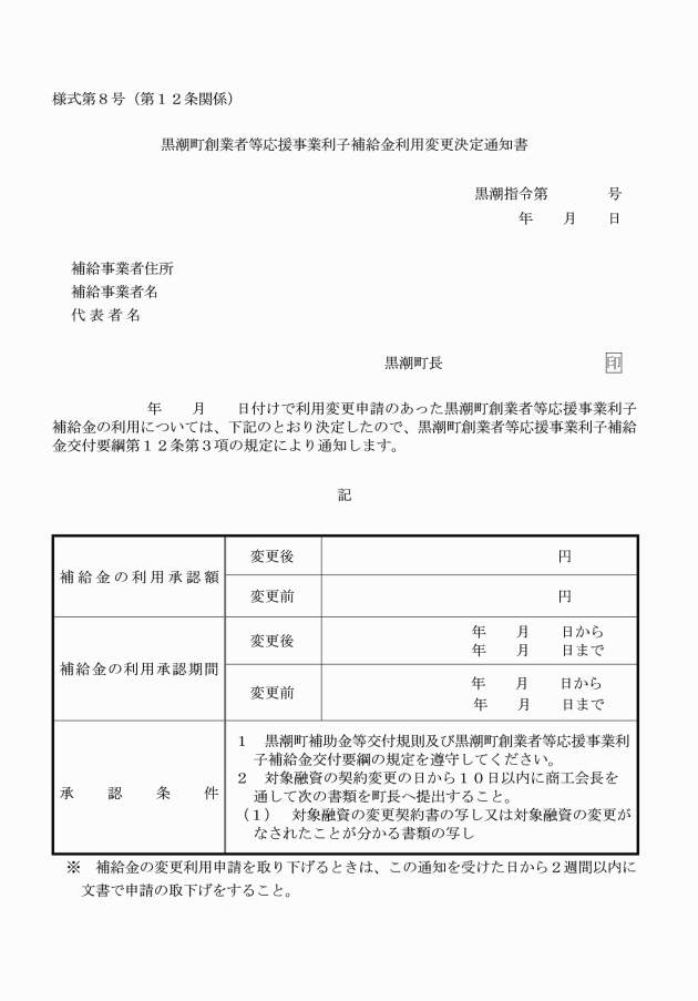 (1) 補給金の利用を中止する場合は、速やかに黒潮町創業者等応援事業利子補給金中止届(様式第4号)により商工会長を通して町長に届け出ること。