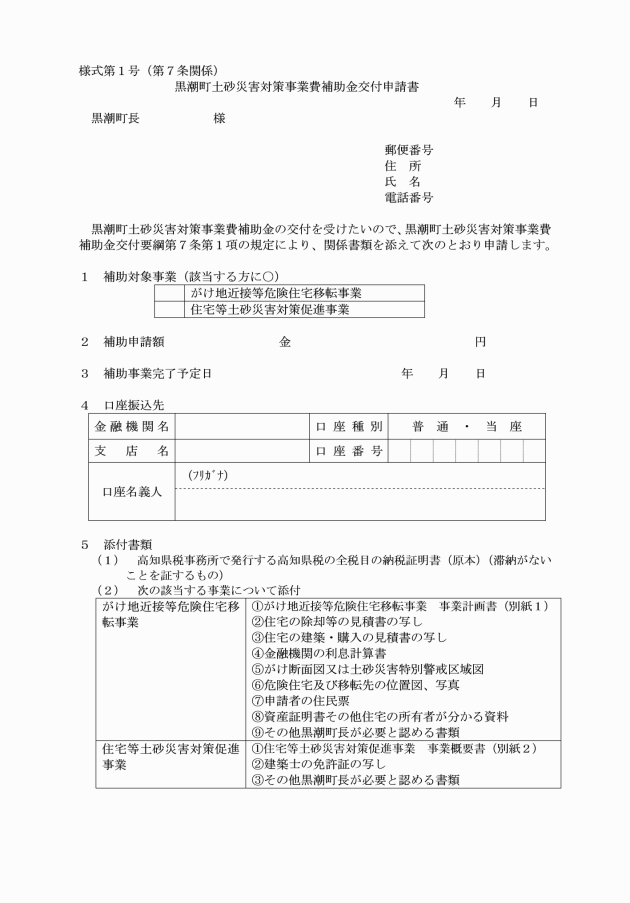 第7条 補助対象者は、補助金の交付を受けようとするときは、黒潮町土砂災害対策事業費補助金交付申請書(様式第1号)に関係書類を添えて、町長に申請しなければならない。