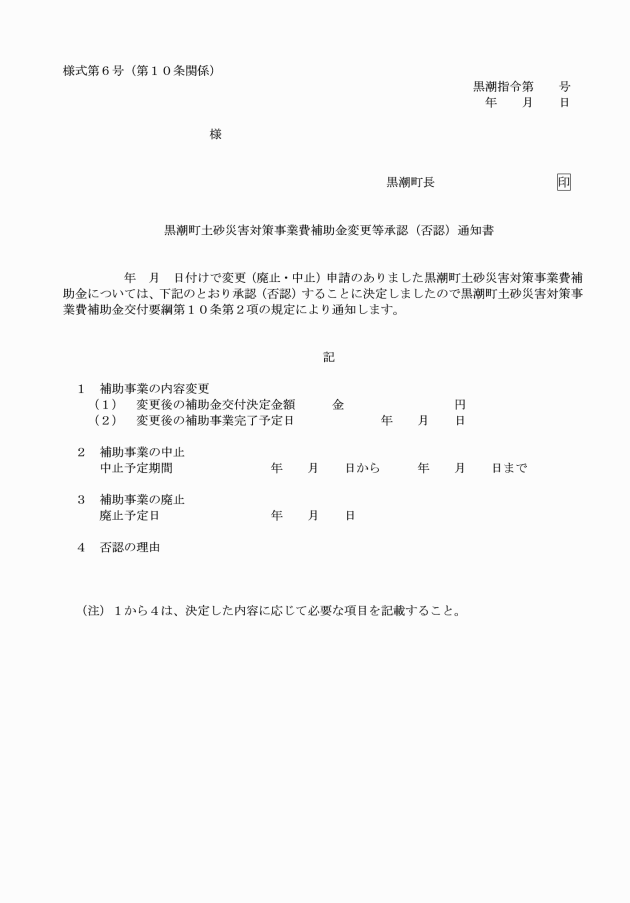 4 補助事業が年度内に完了しない場合には、当該年度の3月31日までに、黒潮町土砂災害対策事業費補助金年度終了報告書(様式第11号)により町長に報告しなければならない。