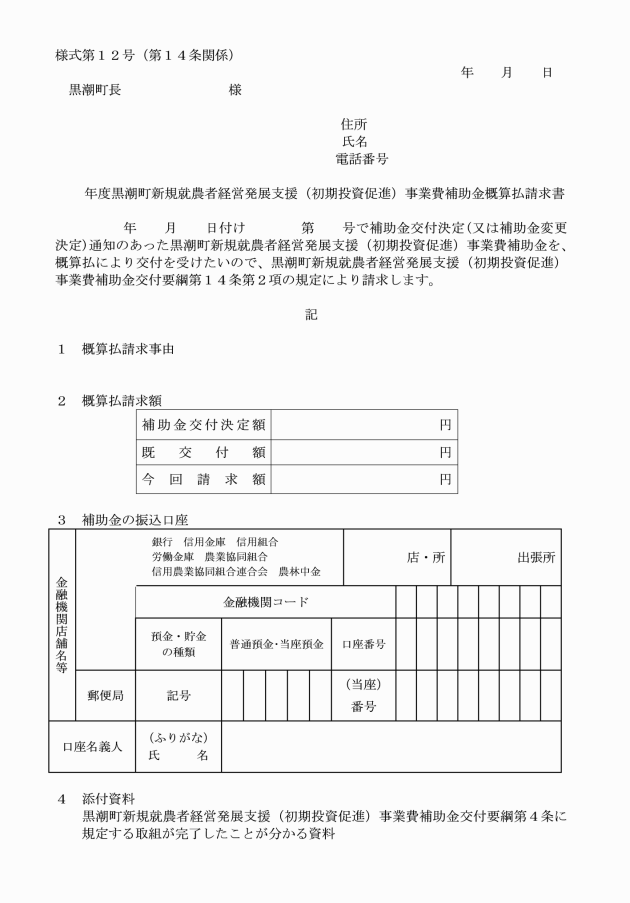 2 交付決定者は、補助金の概算払を受けようとするときは、黒潮町経営発展支援(初期投資促進)事業費補助金概算払請求書(様式第12号)により町長に請求しなければならない。