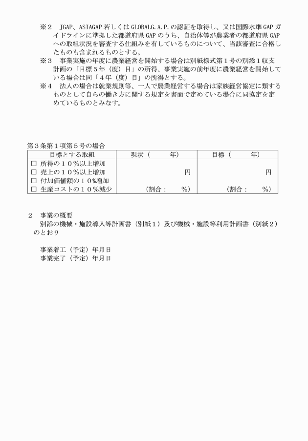 (5) 経営の全部又は一部を継承する場合は、継承する農業経営に従事してから5年以内に継承して農業経営を開始する者であり、継承する農業経営の現状所得、売上若しくは付加価値額を10パーセント以上増加させる、又は生産コストを10パーセント以上減少させる経営発展支援(初期投資促進)事業計画等であると町長が認めること。