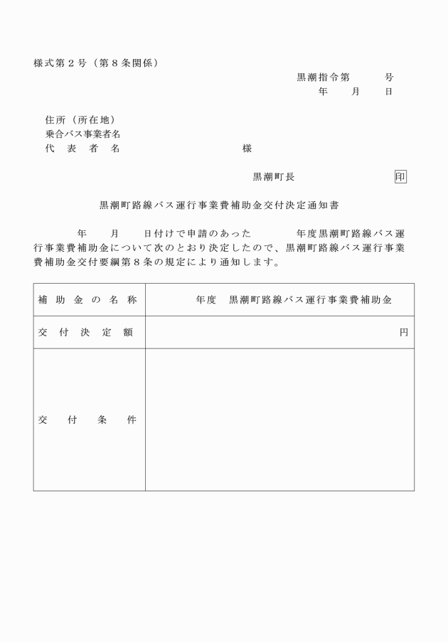 第7条 補助金の交付を受けようとする乗合バス事業者は、黒潮町路線バス運行事業費補助金交付申請書(様式第1号)に必要な書類を添えて、町長に申請しなければならない。