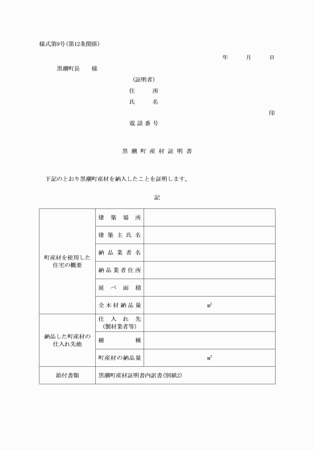 (1) 町内の森林組合、製材業者及び木材販売業者並びに高知県内の森林組合連合会が町産材であることを証明する黒潮町産材証明書(様式第9号)