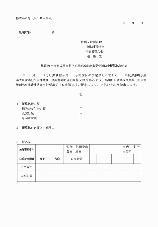 第5条 補助事業者は、補助金の交付を受けようとするときは、黒潮町水産業成長産業化沿岸地域創出事業費補助金交付申請書(様式第1号)により町長に申請しなければならない。